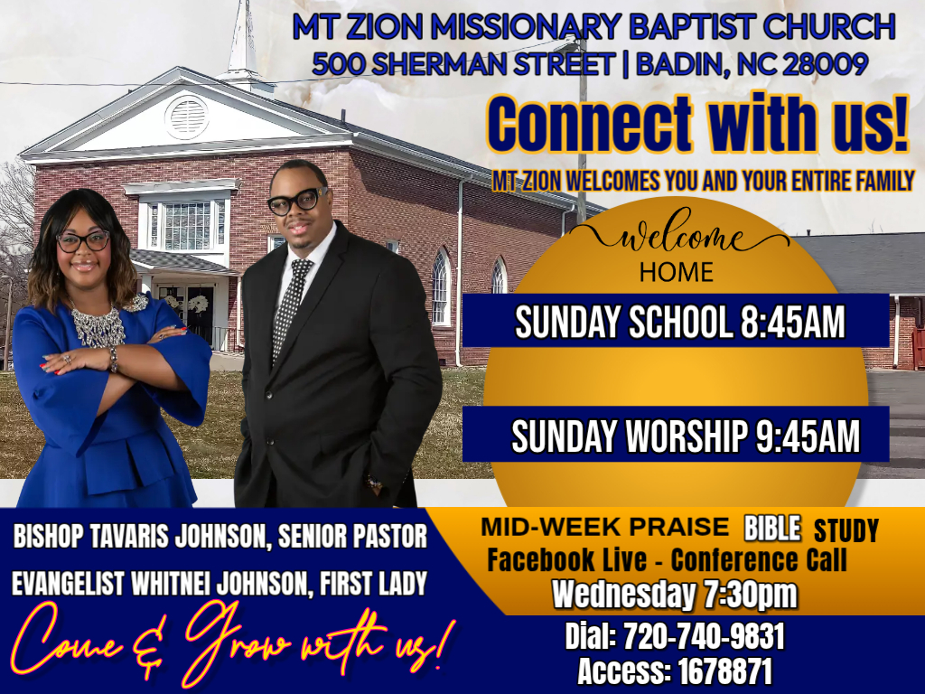 What's Happening At Mt. Zion Our Pastor & First Lady Midweek Praise & WorshipConference Call Number - 720-740-9831Access #1678871 Services About Mt. Zion Ways To Give GIVELIFY – https://giv.li/h275hdSQUARE – Mt. Zion Missionary Baptist Church, BadinMAIL: P.O. Box 968, Badin, North Carolina 28009 Heritage Month Come Worship With Us !!